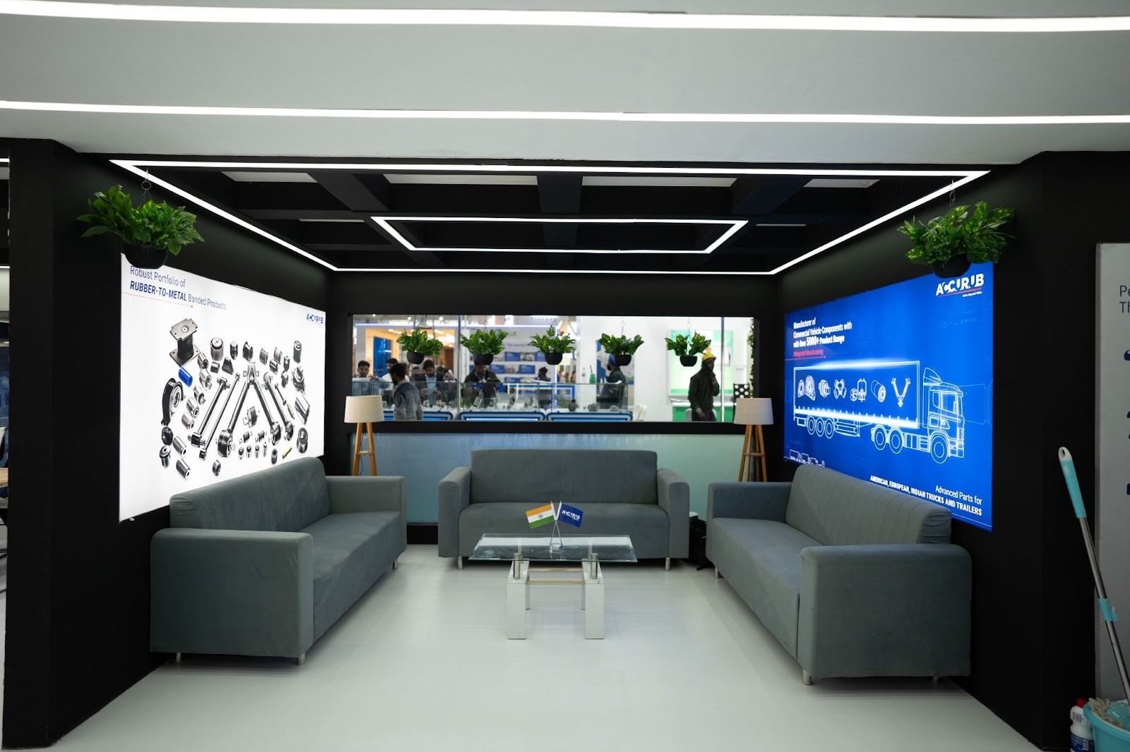 Accurub came in with a clear intent of moving beyond their existing aesthetic while staying rooted in what their customers valued most: their products. They wanted a space that felt industrial and dynamic, yet warm and inviting, reflecting the brand’s strong emphasis on hospitality. The challenge was bringing these contrasting elements together in a way that felt balanced and natural, while also ensuring the booth stood out in a crowded exhibition hall and allowed easy movement for visitors.