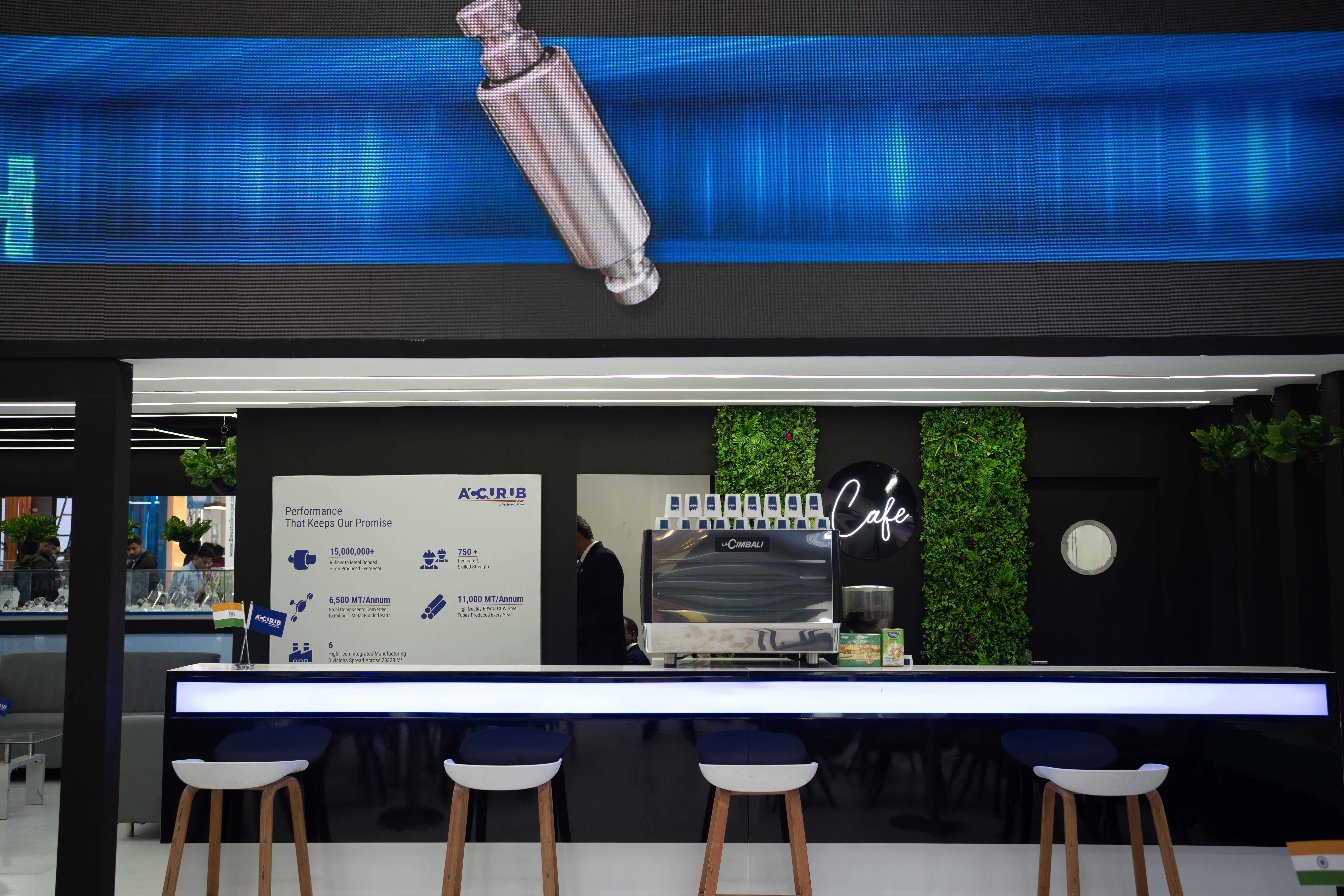 To bring this vision to life, Blues N Coppers designed and executed a 195 sqm island booth. Inspired by Accurub's branding elements and products, the booth had an industrial and modern design while balancing a warm and inviting aesthetic. This was achieved by using angular and geometric shapes, warm lighting and beige wooden floors.